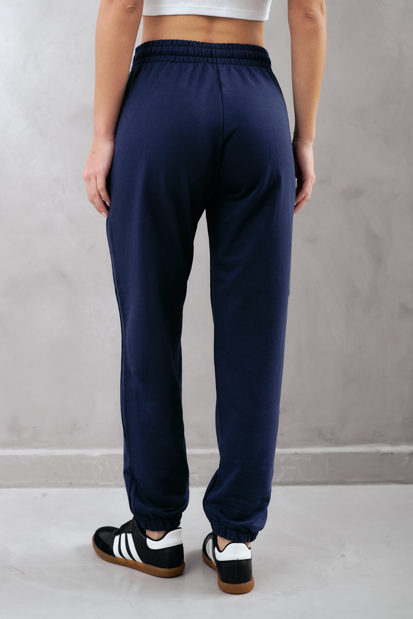 La modelo usa Jogger Indigo/Avena/beige7 Talle 2 (t38/40 en jeans) y Azul marino/Cereza Talle 1 (t36/38 en jeans)