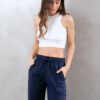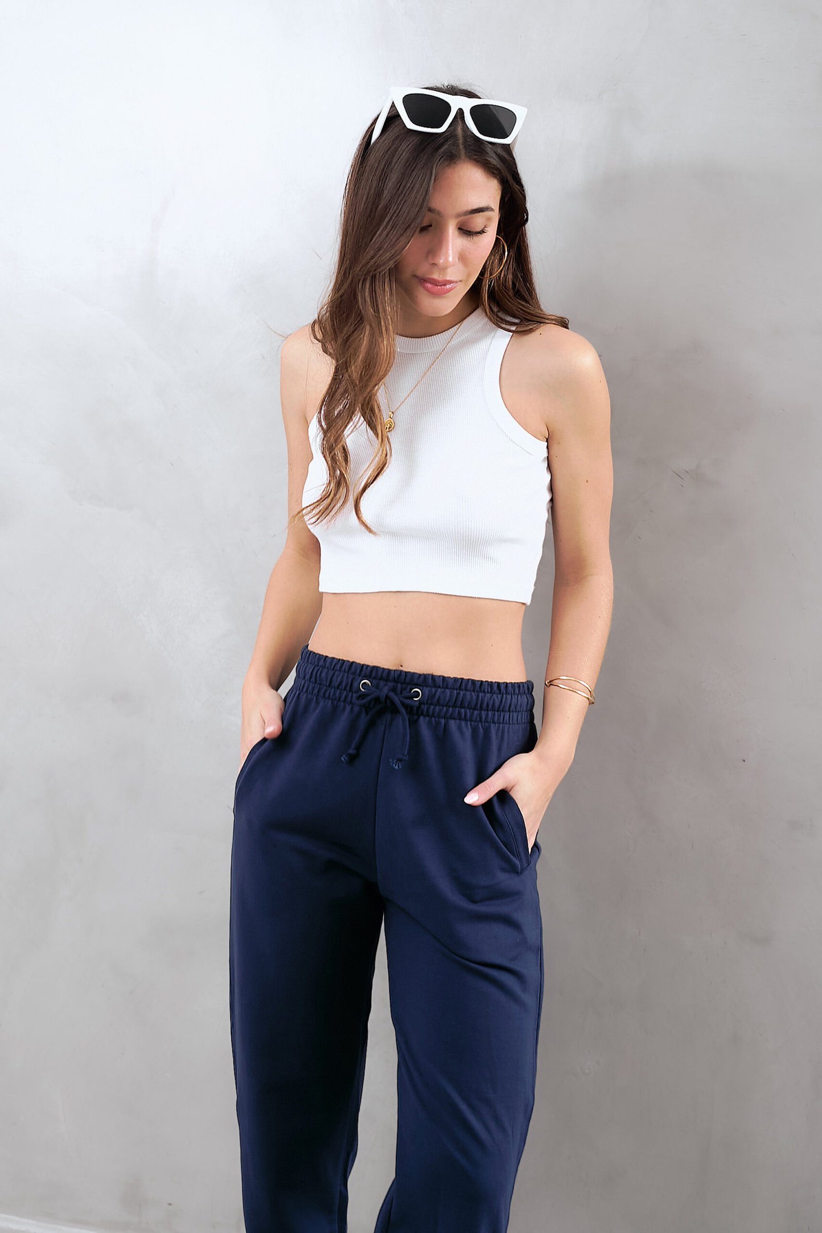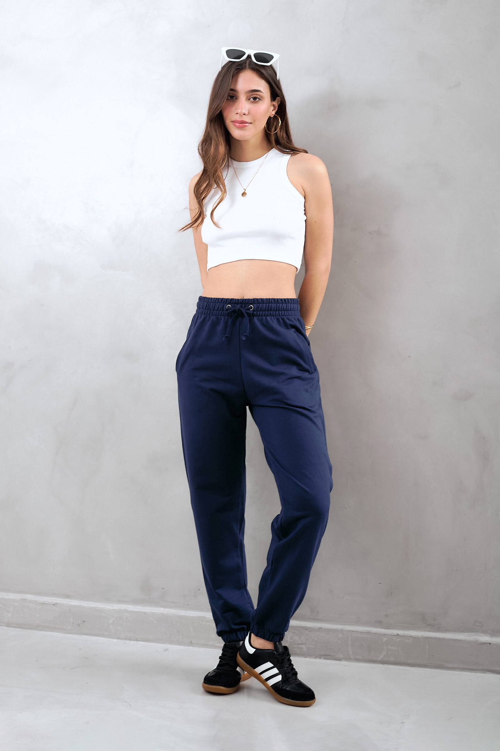 Jogger tiro alto + elástico en la cintura + cordón ajustable +bolsillos delanteros +puño con elástico. Tela: algodón rústico liviano peinado.