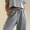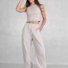 Jogger tiro alto + elástico en la cintura + cordón ajustable +bolsillos delanteros +puño con elástico. Tela: algodón rústico liviano peinado.