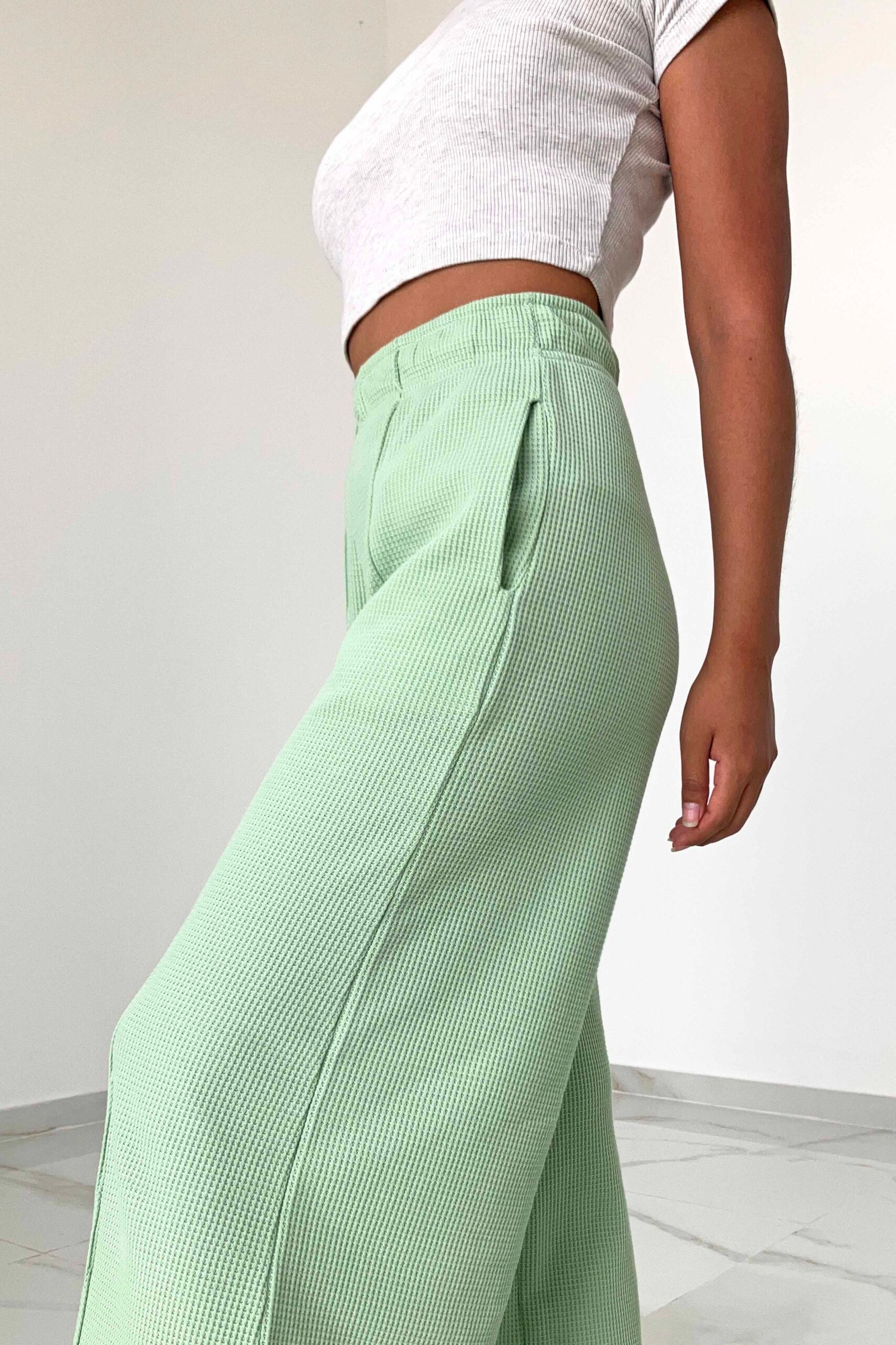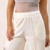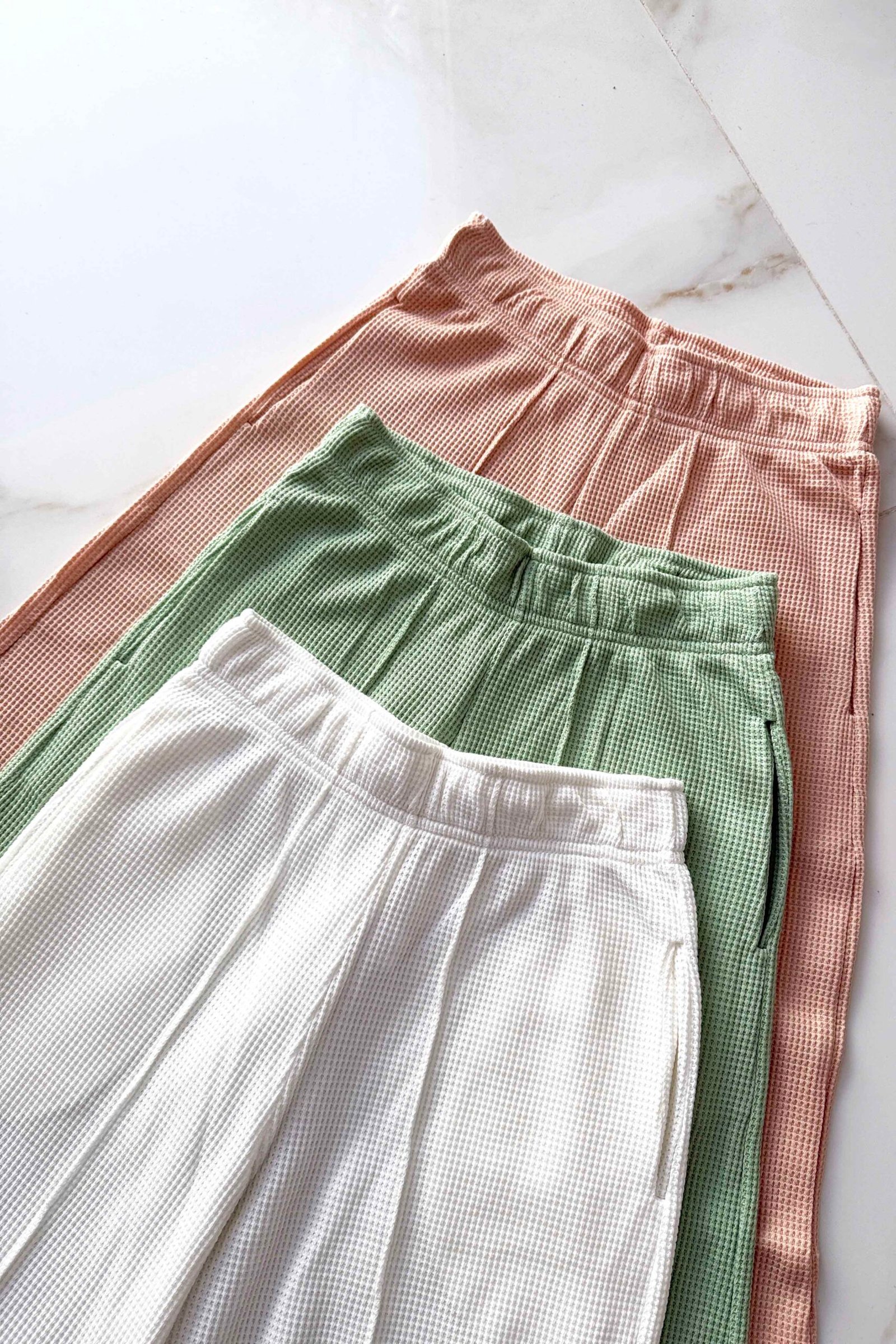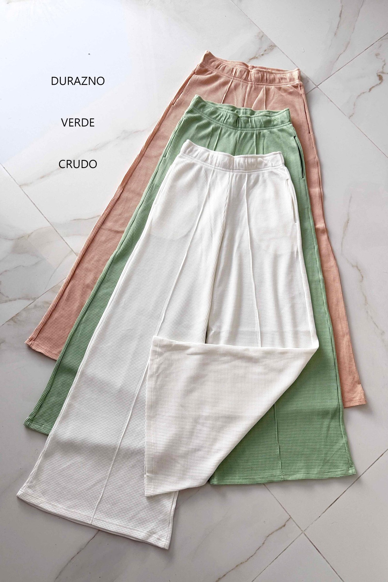 Modelo tiro alto + elástico en la cintura + bolsillos delanteros + alforza. Tela: algodón waffle (Composición: 50% algodón. 50% poliéster).