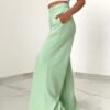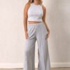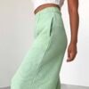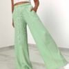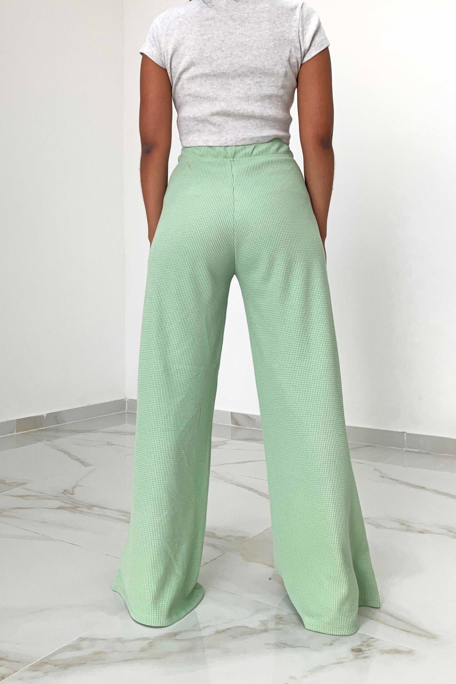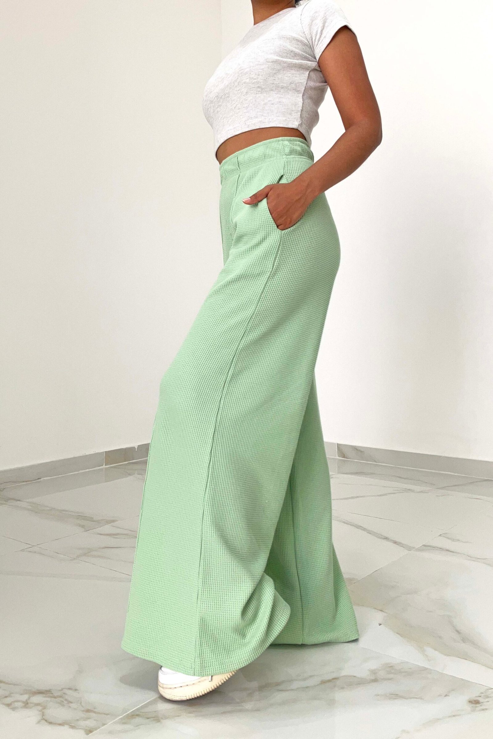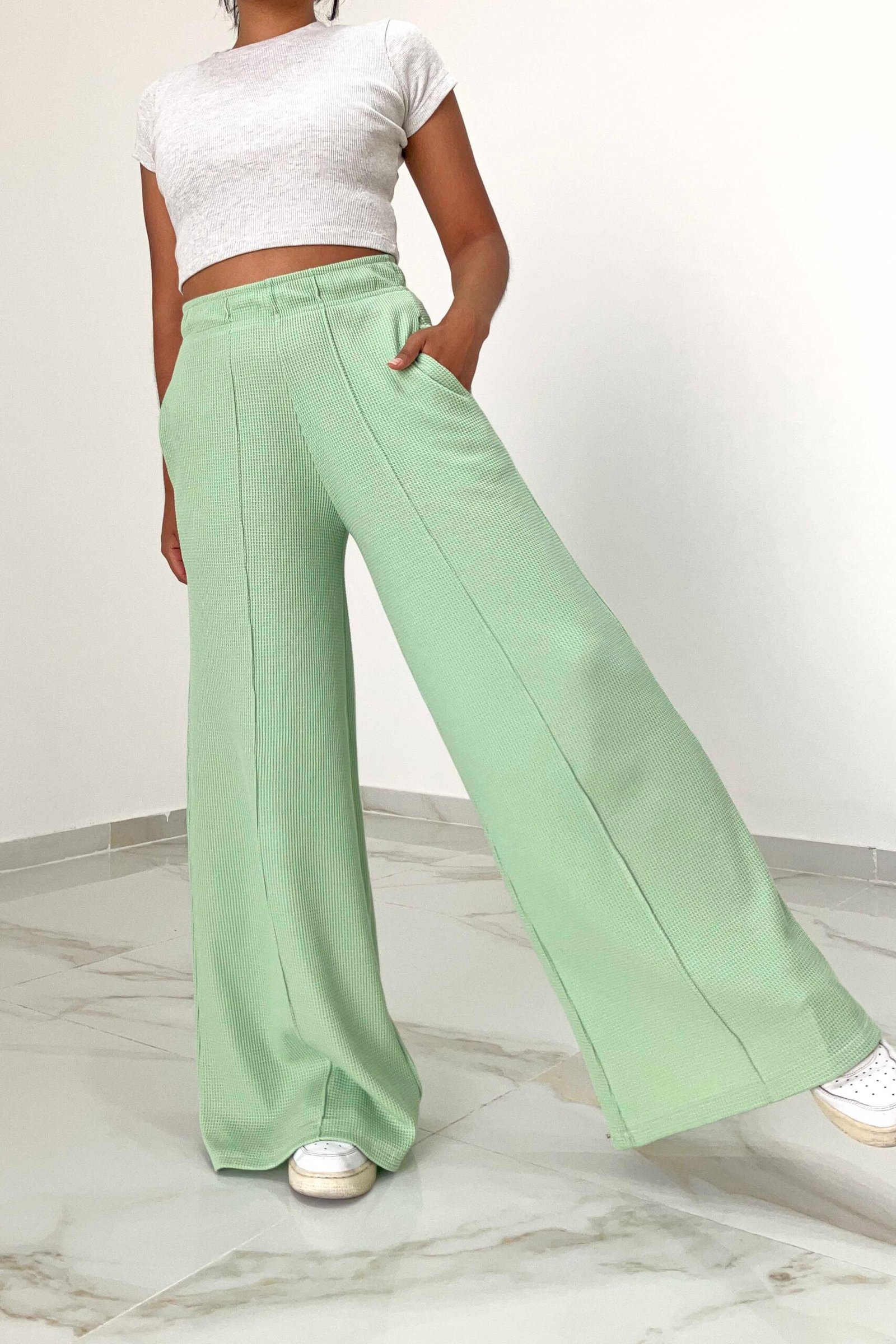 Modelo tiro alto + elástico en la cintura + bolsillos delanteros + alforza. Tela: algodón waffle (Composición: 50% algodón. 50% poliéster).