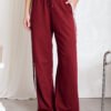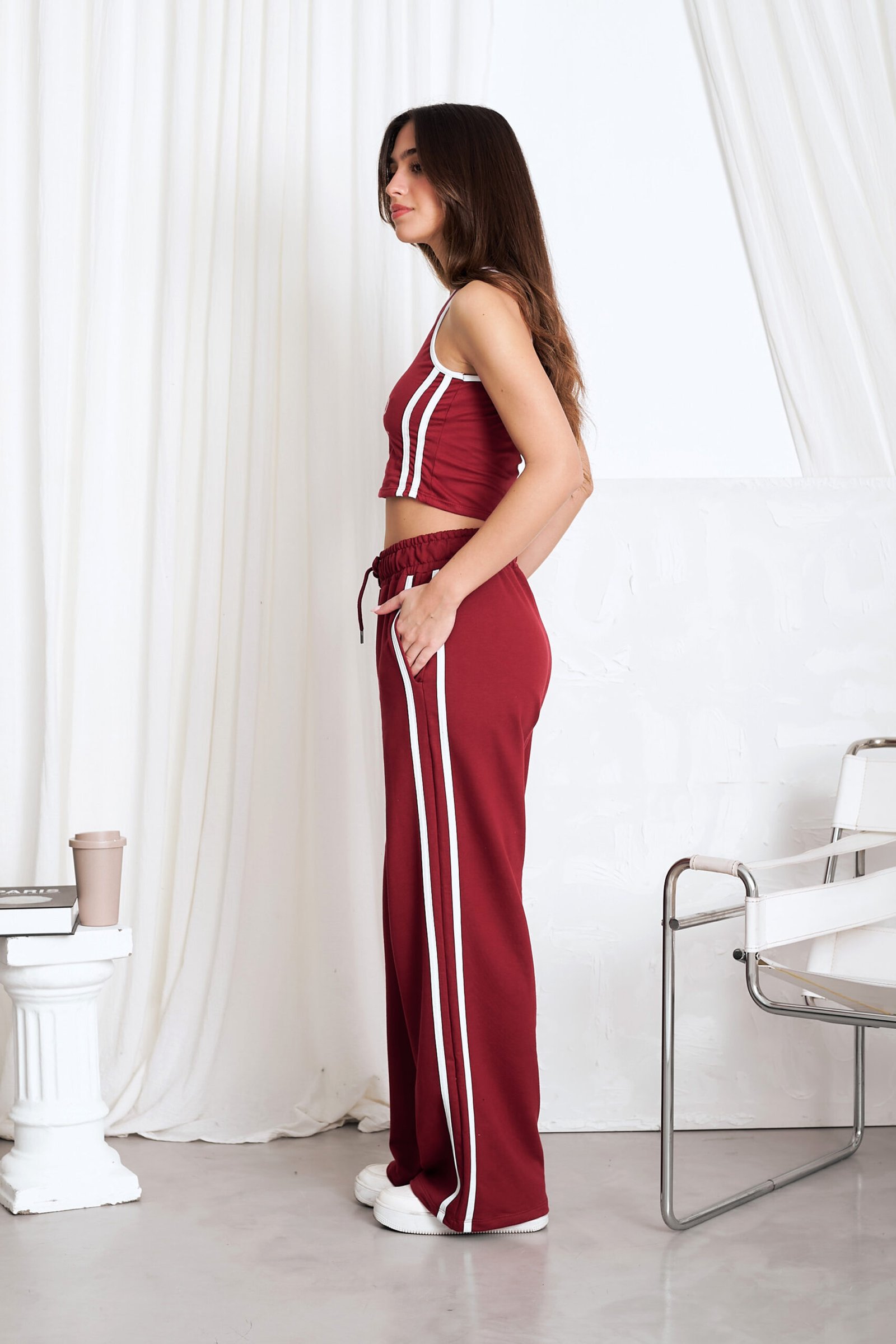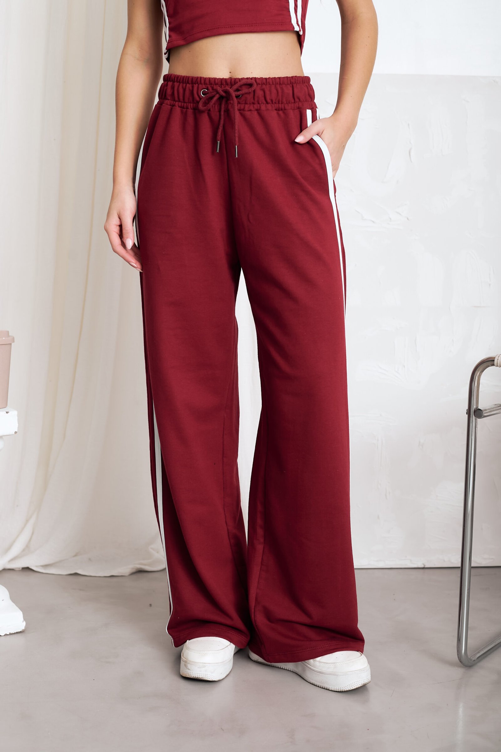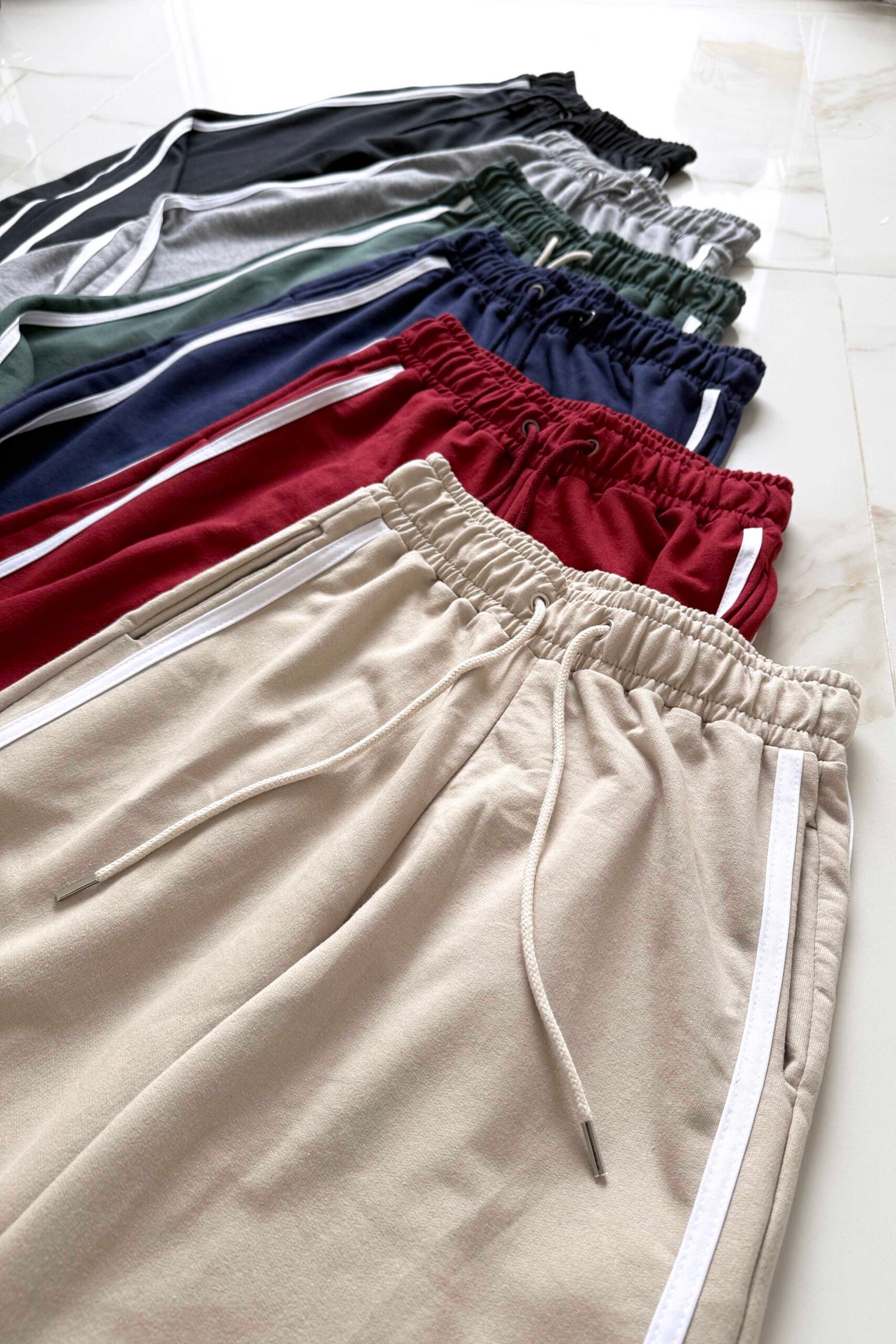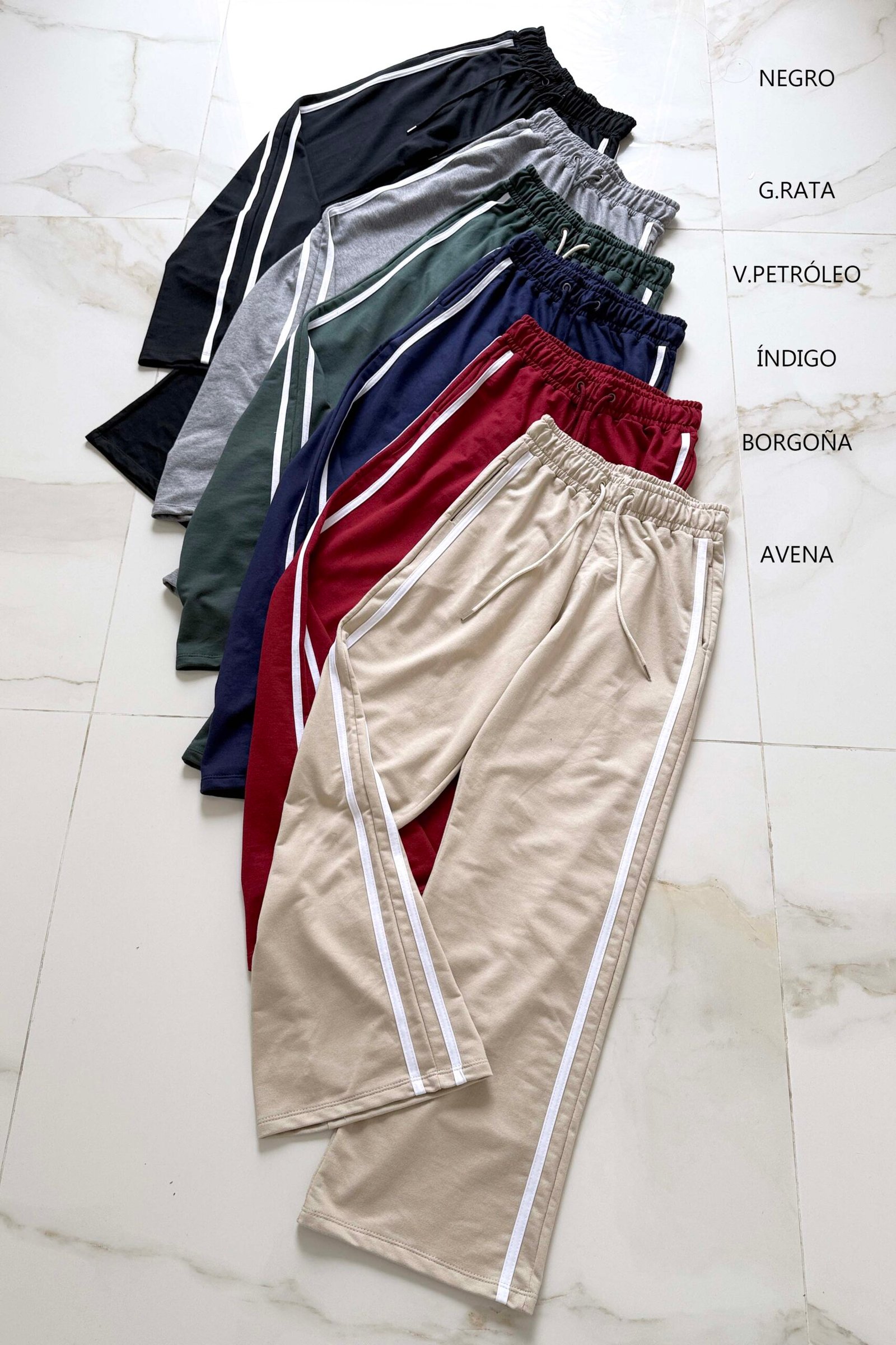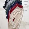 Modelo tiro alto + elástico en la cintura + cordón ajustable + bolsillos delanteros + 2 rayas laterales . Tela: algodón rustico liviano peinado.