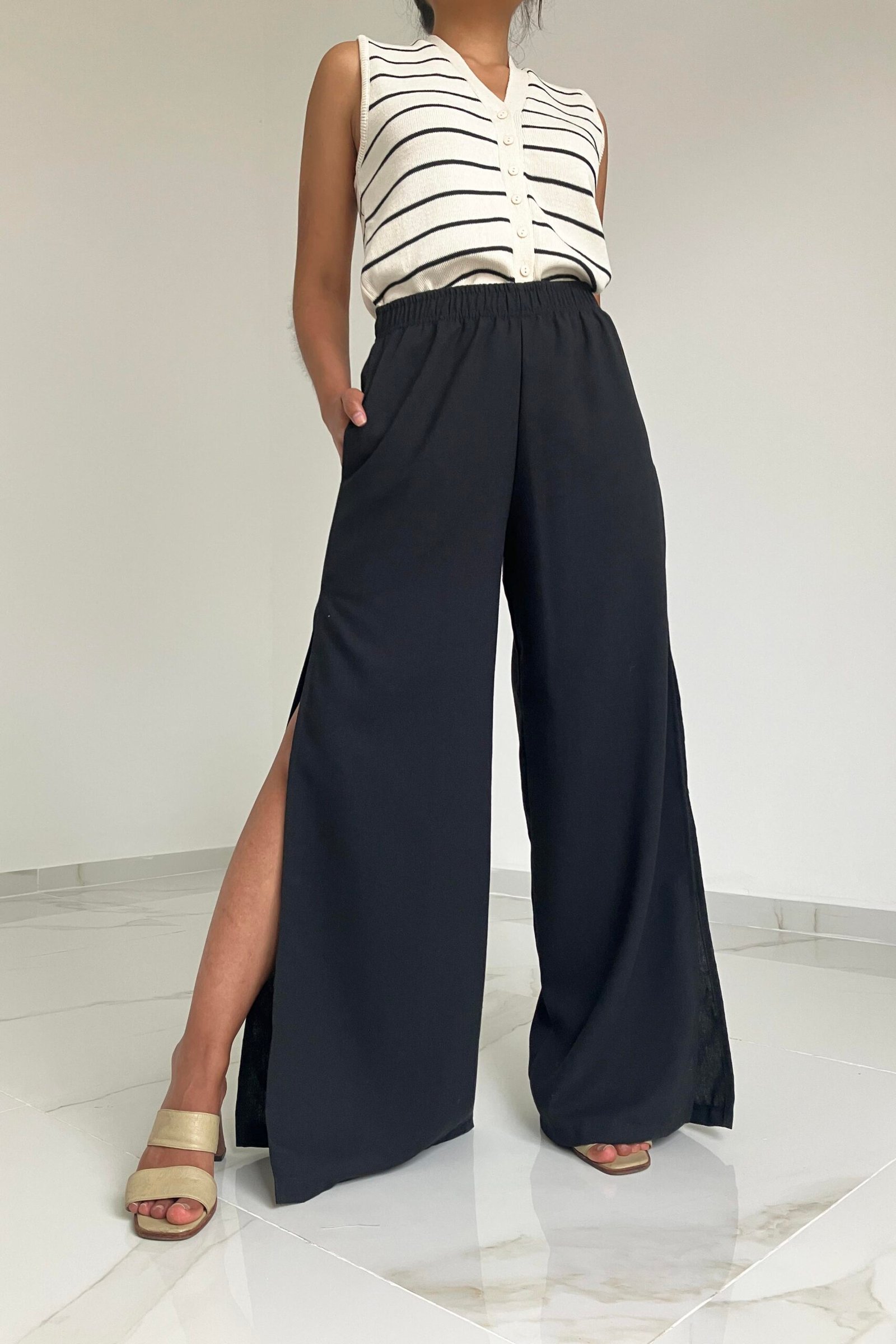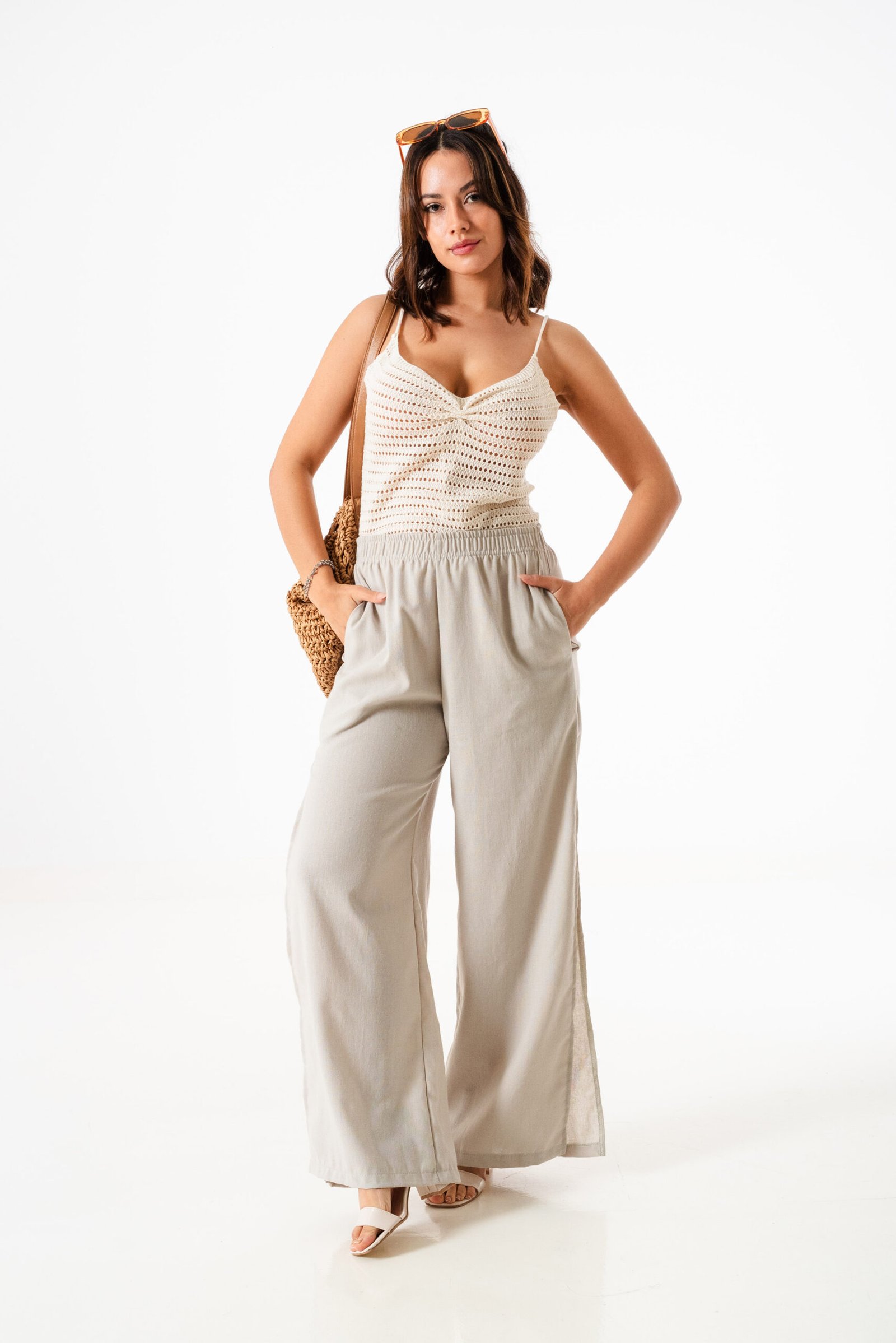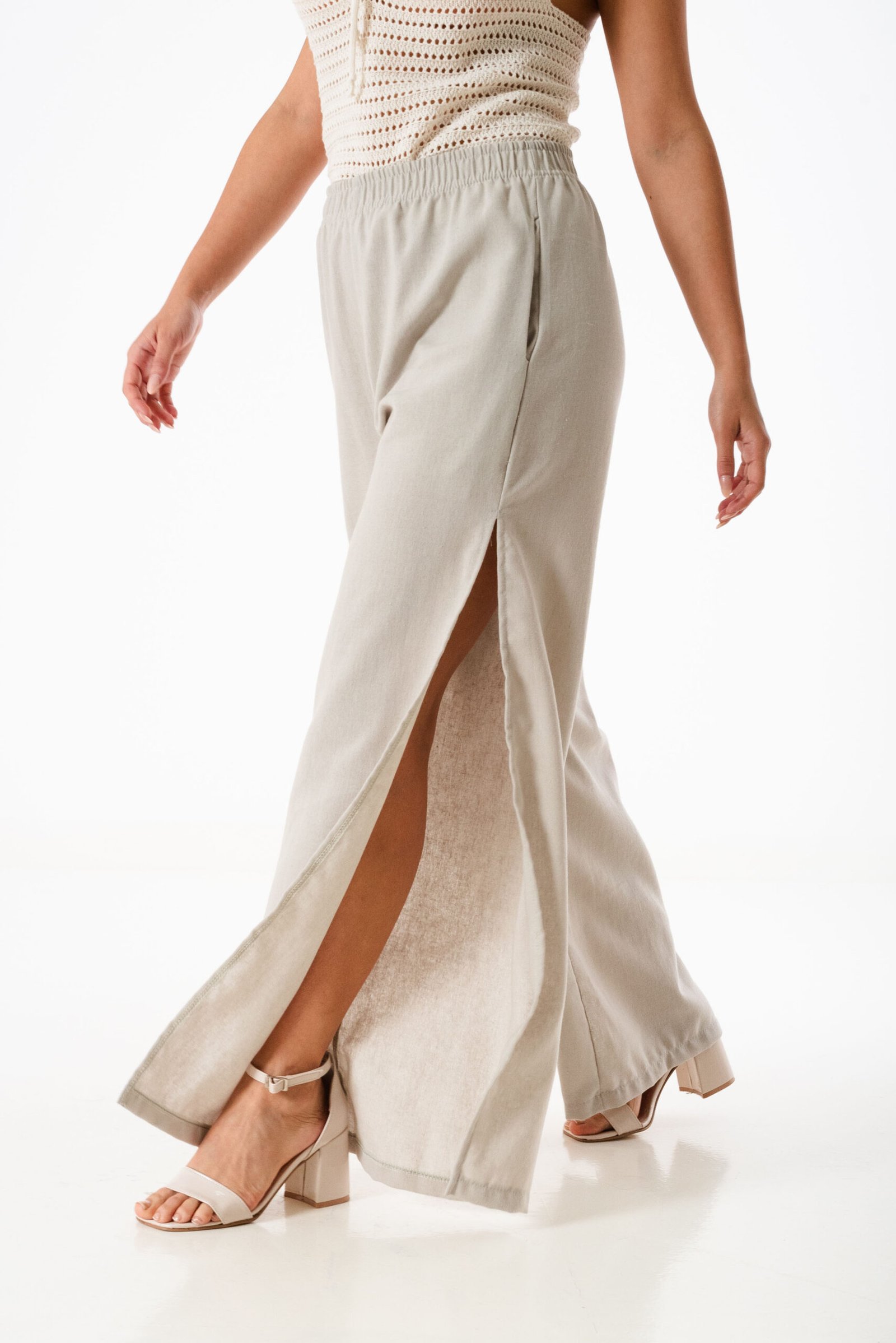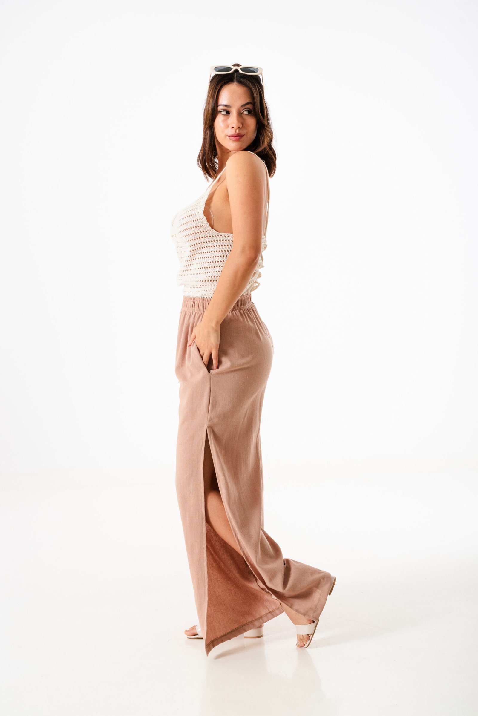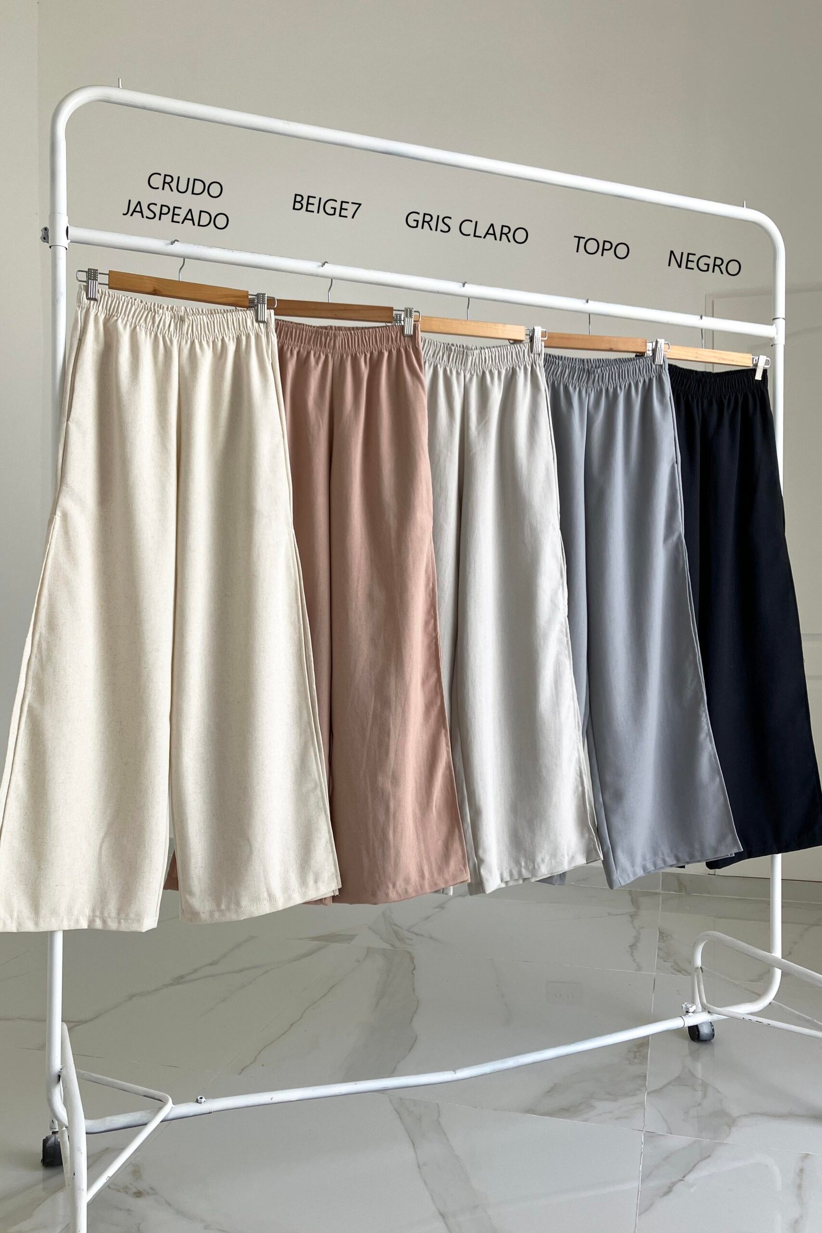 Modelo tiro alto + elástico en la cintura + bolsillos delanteros +tajo lateral . Tela: lino pantalonero.