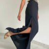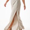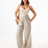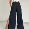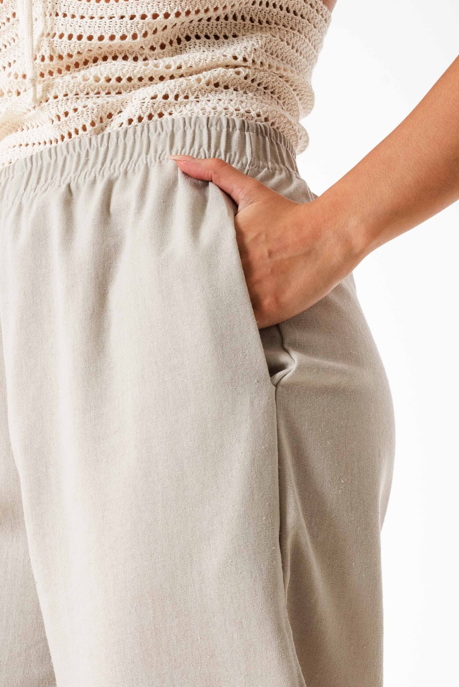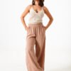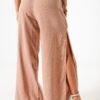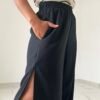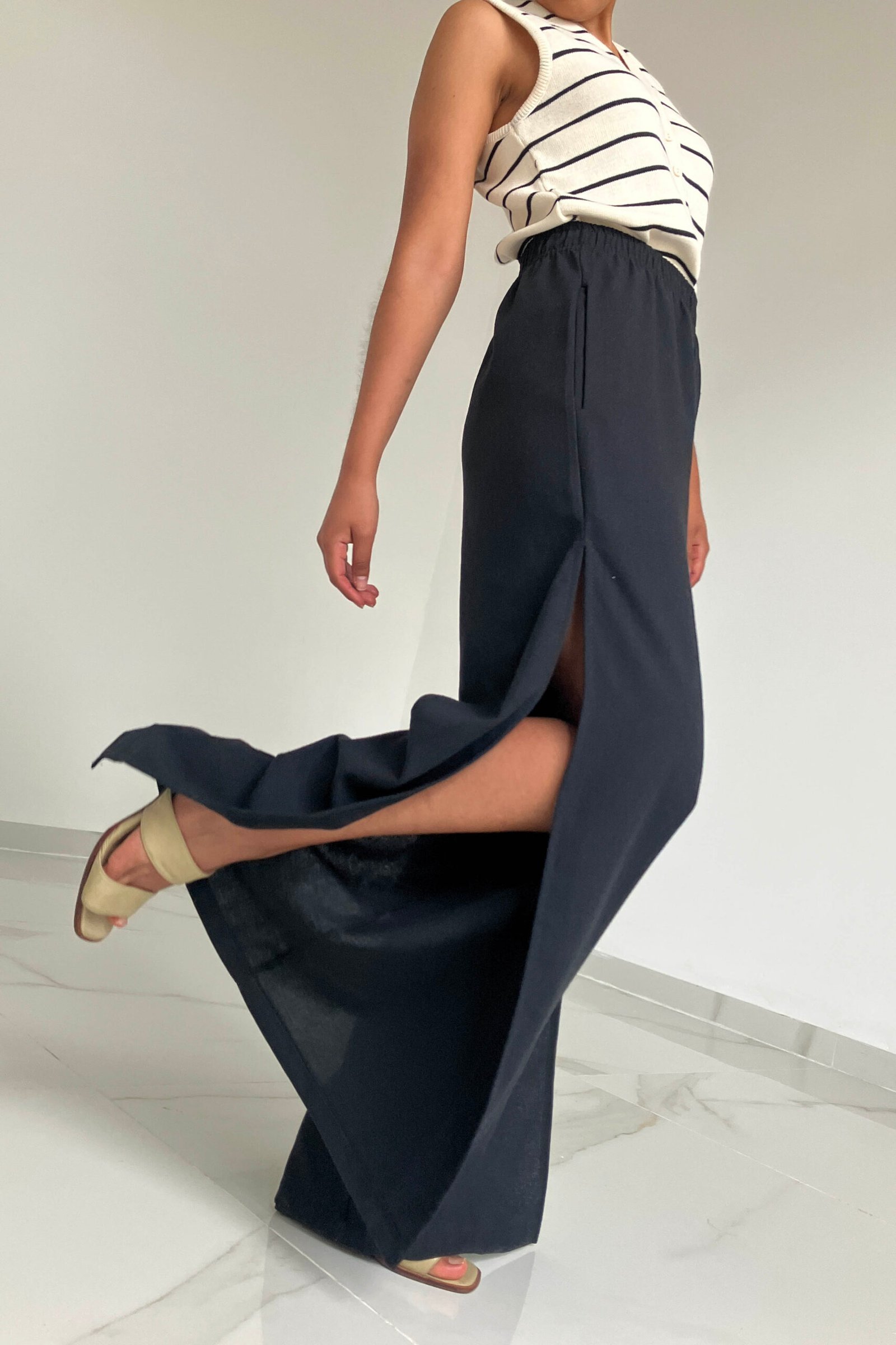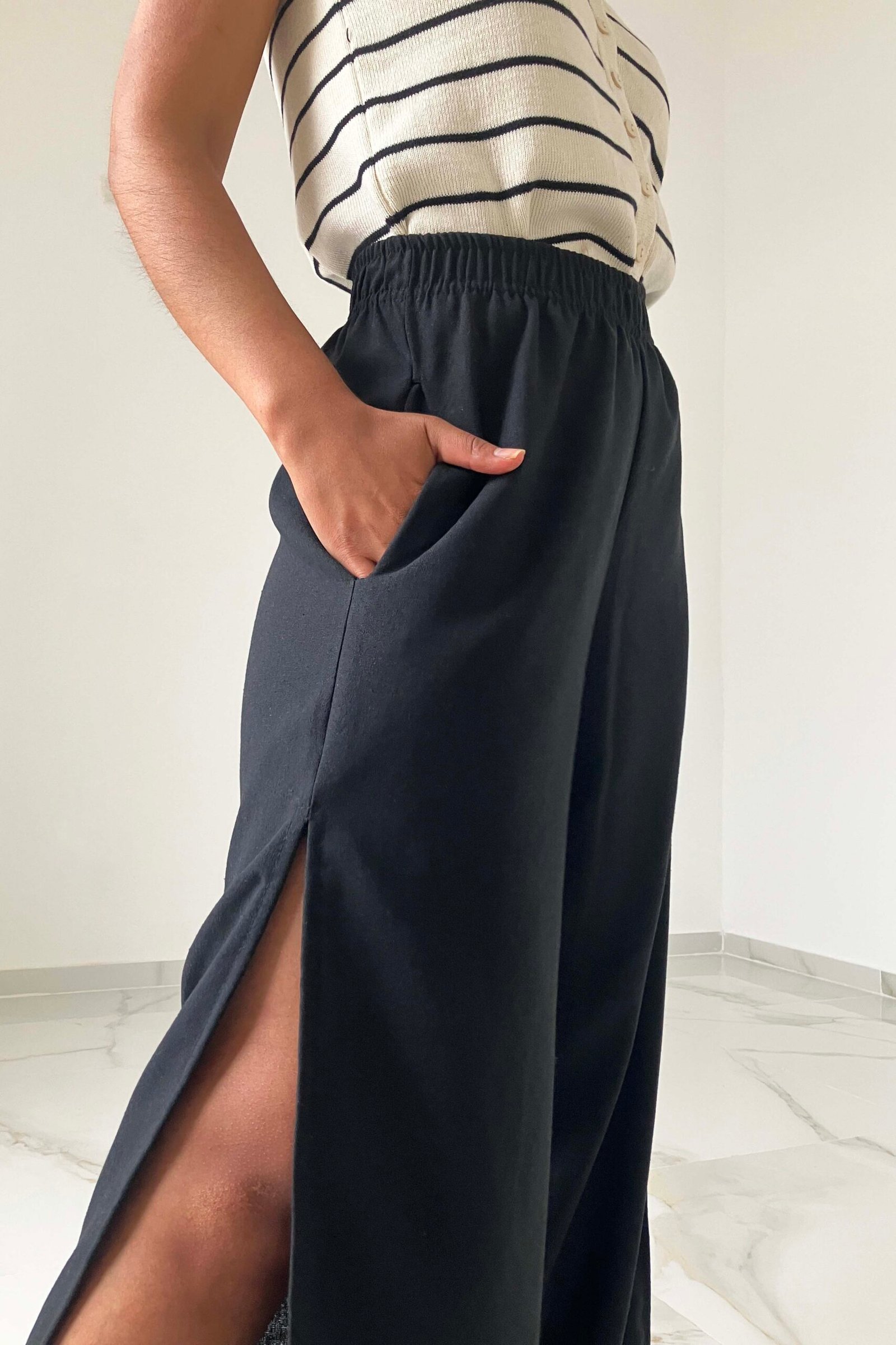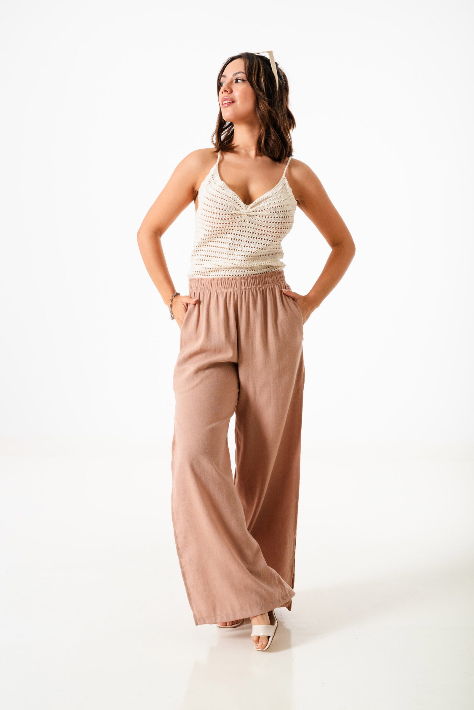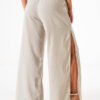 Modelo tiro alto + elástico en la cintura + bolsillos delanteros +tajo lateral . Tela: lino pantalonero.