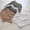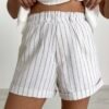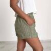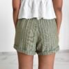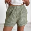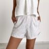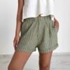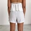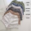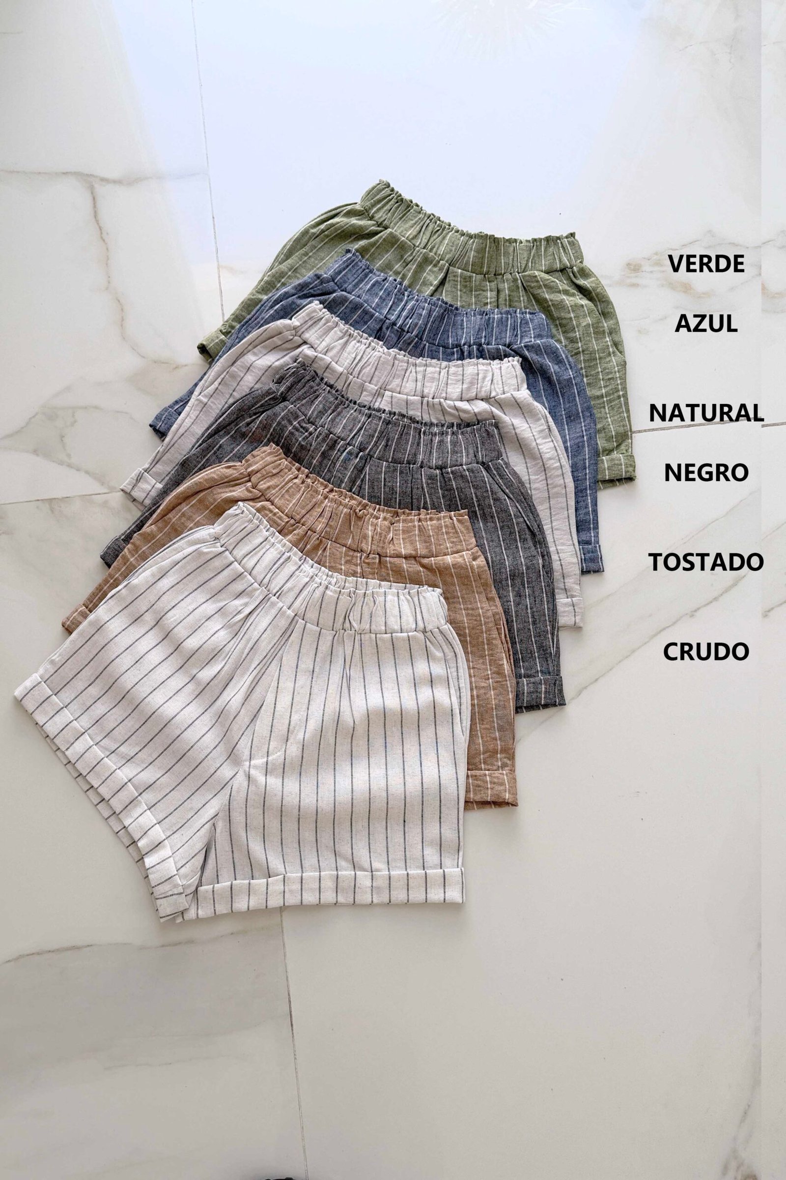 Modelo tiro alto + elástico en la cintura + bragueta falsa + bolsillos delanteros+ dobladillo inferior. Tela: lino rayado